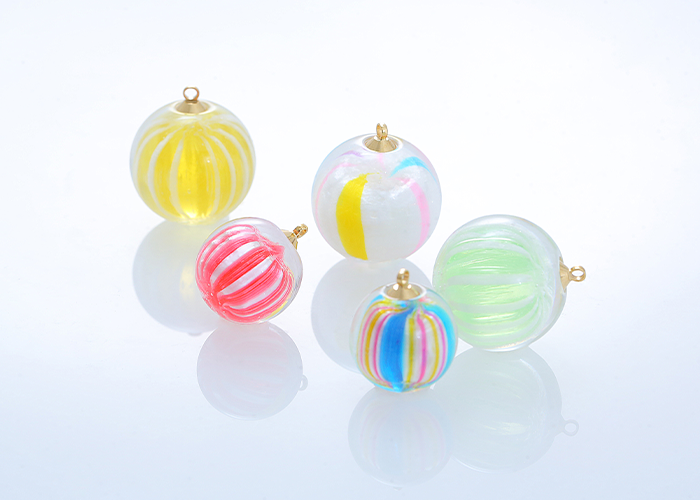 2005年、お干菓子のひとつ「飴」を樹脂で再現するのではなく、本物の飴の繊細なデザインをそのまま活かしたいと思い、樹脂コーティングすることに成功しました。【知的財産権取得】